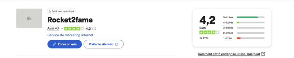 Rocket2fame obtiene un calificación promedio de 4,2/5 en TrustPilot, lo cual es bastante bueno. Sin embargo, no hay ninguna página oficial listada en Google Reviews.